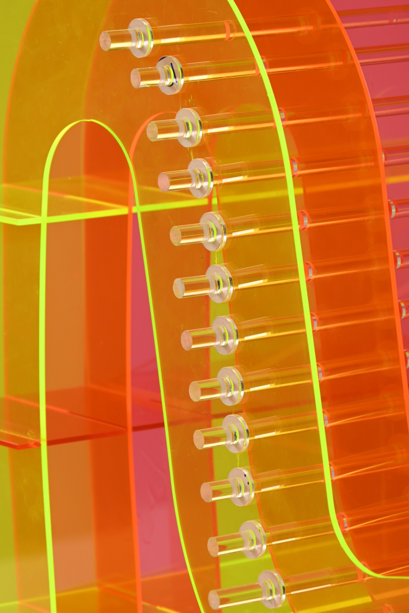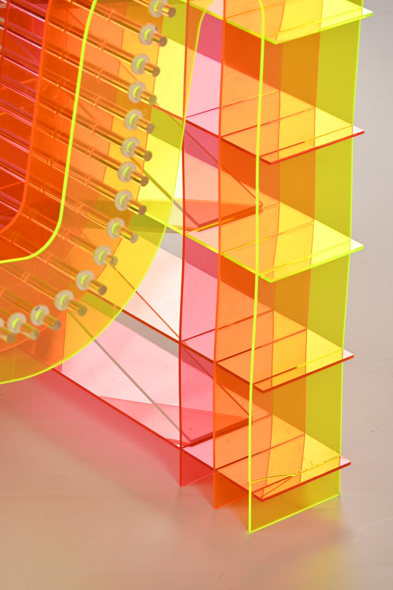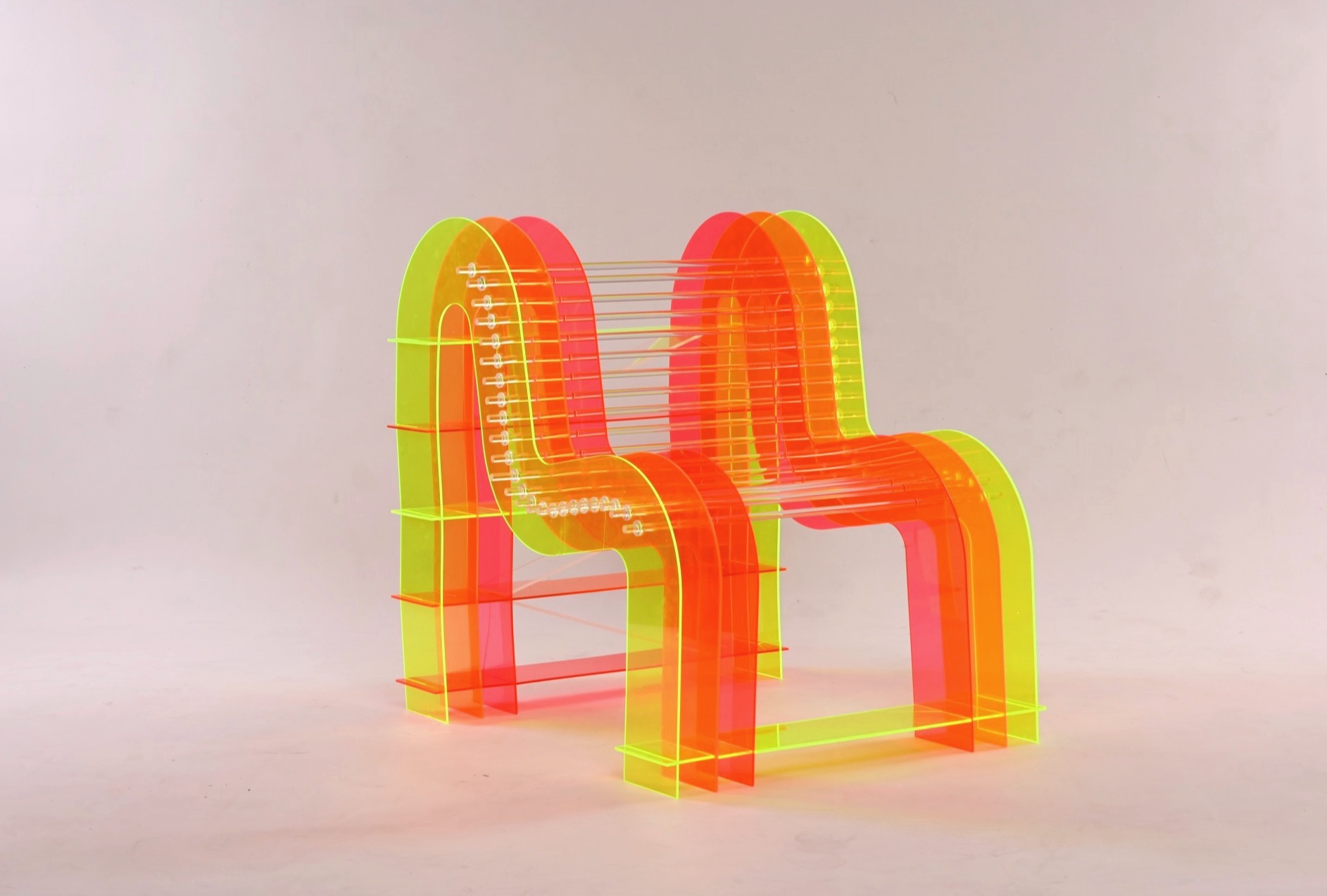 Diseño y ejecución de una silla para niños hecha 100% en acrílico traslúcido, partiendo del concepto de Repetición Sinuosa. El proyecto se inspira en el trabajo de los maestros Florence Knoll y Andy Warhol, exaltando las formas orgánicas y la combinación de colores vibrantes para crear piezas llamativas que generen imponencia visual.